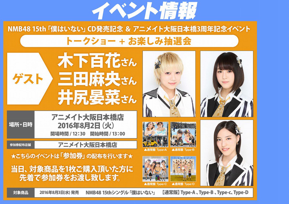 8/2(火)13:00よりNMB48 15th「僕はいない」CD発売記念&アニメイト大阪日本橋3周年記念イベント 木下百花、三田麻央トークショー +お楽しみ抽選会 https://t.co/5iXclPTFnd