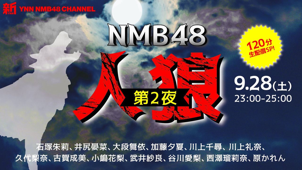 #新YNN 9/28(土)23:00-25:00 「NMB48人狼 第2夜」120分生配信SP!出演:石塚朱莉、井尻晏菜、大段舞依、加藤夕夏、川上千尋、川上礼奈、古賀成美、小嶋花梨、武井紗良、谷川愛梨、西澤瑠莉奈、原かれん