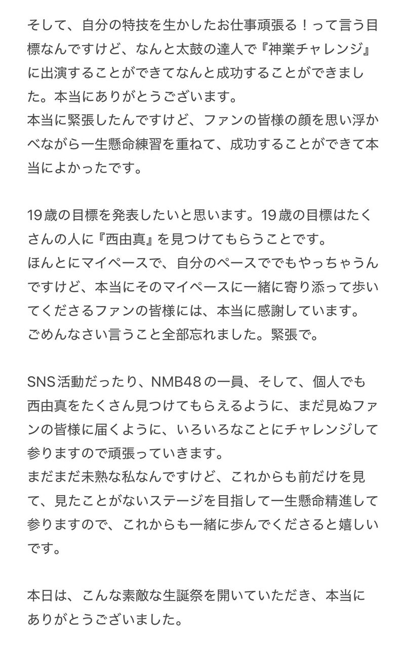 西由真「19歳の目標は、たくさんの人に『西由真』を見つけてもらうことです!」#NMB48 #Mのサイン公演 #西由真生誕祭2025 pic.twitter.com/Rn7lcZQNvH